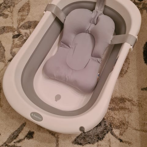 Sammenleggbart badekar til baby med badepute/badestøtte. (Likt som Twistshake sitt badekar/pute.) Kjøpt nytt på Jollyroom av meg høsten 2025.