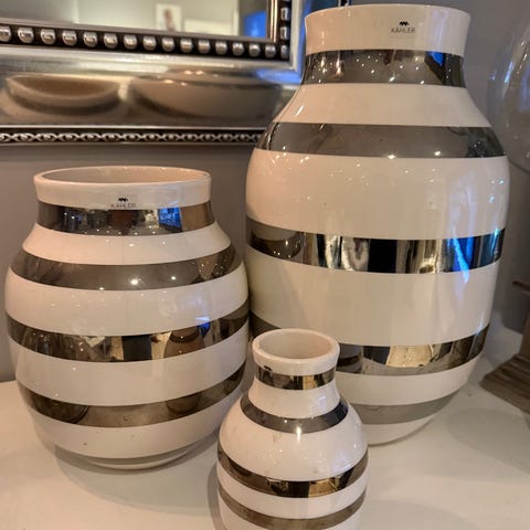 Kähler Omaggio vaser i keramikk, hvit med sølvfargede striper. Bildene viser et sett med tre vaser i ulike høyder, egnet til bruk som blomster- eller pyntevaser. Serien kjennetegnes av den avrundede formen og de horisontale stripene. Passer til plassering på bord, hylle eller vinduskarm, enten samlet som gruppe eller hver for seg.