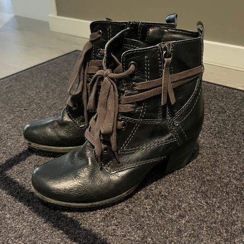Ankelstøvletter i sort skinn fra Tamaris størrelse 40. Overdelen er i glatt skinn med dekorative sømmer og reim med dusker rundt ankelen. På tåen er det en tøff metalldetalj. Yttersålen har litt mønster for bedre grep. Passer som hverdags- eller pensko. Med støtdemping i hæl som gjør de mer behagelige å gå i.