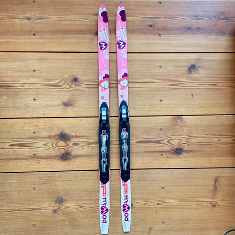 Skiene har rosa og lilla design med blomstermotiv. De er utstyrt med integrerte bindinger som passer til klassisk langrenn.