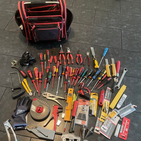 Smådelskap og verktøykasse egnet for oppbevaring av skruer, muttere, spiker og annet smått verktøytilbehør. Smådelskapet har flere skuffer med etiketter for sortering av innhold. Verktøykassen i plast har lokk og bærehåndtak for enkel transport og organisering av mindre verktøy og deler. Godt brukt