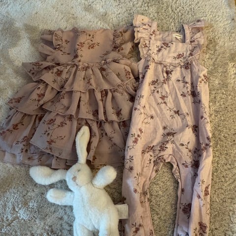 Newbie sett barneklær for jente i størrelse 80 i beige nyanser. Sett med flere plagg, blant annet ribbestrikkede deler, body og bukse med blomstermønster samt en strikket cardigan. Passer til hverdagsbruk og kan kombineres på ulike måter. Materiale er mykt og behagelig for barn (blandingsmateriale, nøyaktig sammensetning ikke oppgitt).