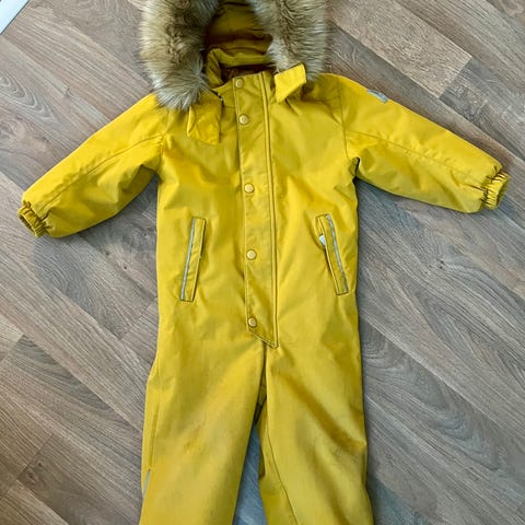 Dress for barn fra Reima i str 98. Normal slitasje, men ingen hull på rumpe eller knær, antydning til et lite hull nederst ved glidelås. Slitasje på reflekser og slitne strikk, men funker enda. Godt med bruk igjen, kan med fordel impregneres. Tror den har vannsøyle 8k.