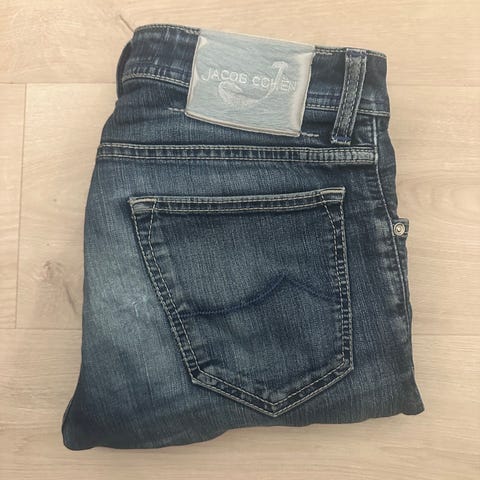 Selger en ekte og eksklusiv Jacob Cohen jeans i en nydelig lys vask. Buksen er veldig pent brukt og fremstår som strøken – ingen slitasje eller skader.