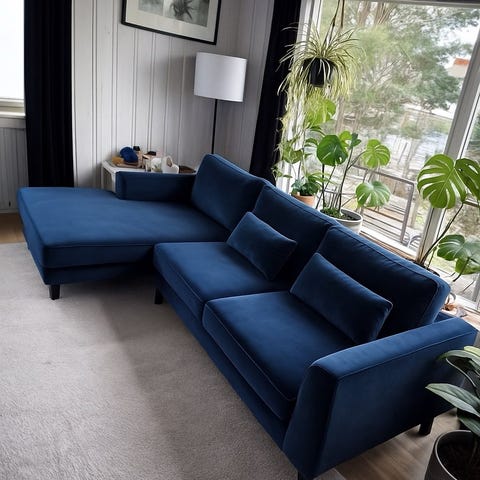 Smedstorp 3-seter sofa med sjeselong i lekker kongeblå farge selges. Sofaen ble kjøpt høsten 2021 (har kvittering), men har vært lite brukt inntil de siste fire månedene. Sofaen selges nå da vi har pusset opp og fargen passer dessverre ikke så godt lenger.
