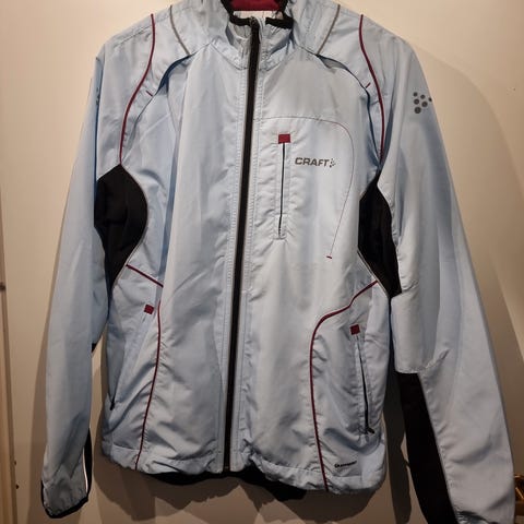Craft jakke for dame i størrelse L. Jakken er svart med rosa detaljer og er laget hovedsakelig av polyester. Den har gjennomgående glidelås i front, høy krage,og flere paneler for god passform. Materialet er lett og egner seg til bruk ved trening eller annen utendørs aktivitet. Refleksdetaljer på ryggen gir økt synlighet i mørkere omgivelser. Jakken har elastiske avslutninger og er konstruert for