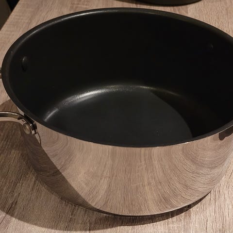 Fungerer ikke på induksjon . En liten kjele med lokk ( ikke original lokket ) pluss en 2 l tipper jeg . Liten lett stekepanne . Passer akkurat ett egg i den .pris er totalt for alle 3.