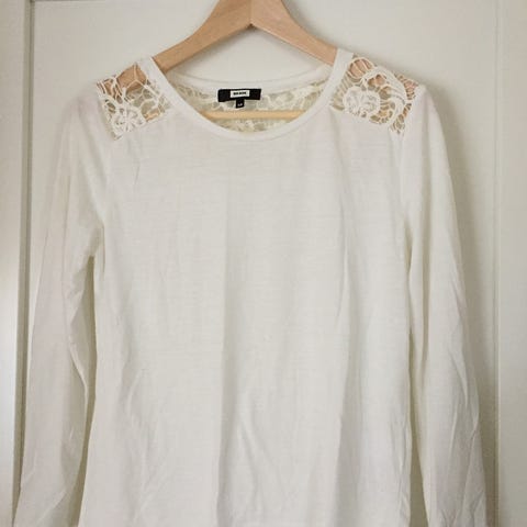 Toppen har silkeaktig stoff og er ganske gjennomsiktig, i front er det blondekant og knapper hele veien ned. Toppen og blondene er en blanding av hvitt og Off White vil jeg si, bortsett fra knappene som er i en slags sølvfarge. Toppen rekker meg til ca bukselinningen, kanskje litt over, jeg er mellom 1.75 og 1.76 høy. Den har ikke ermer , men heller ikke stropper så litt mer som en vest i ermene.