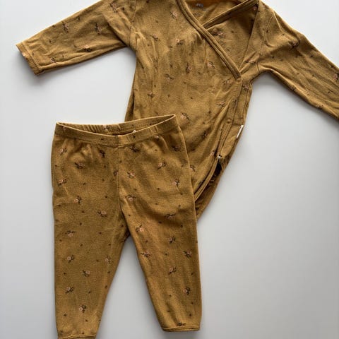 Konges Sløjd badetøy i str 68/74 i flerfarget design. Settet består av en langermet overdel med volangkrage og mønster, samt en stripete heldrakt med kortere ben og volangkrage. Plaggene har mykt, glatt stoff med innhold av polyamid og elastan, som gir god stretch og bevegelighet.