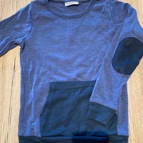 WoolLand ullgenser for barn/unisex i størrelse 152. Genseren er i blå ull med lange ermer og høy hals med to knapper i front. Den har kontrastfargede albuelapper og ribbekant nederst. Egner seg som mellomlag eller innerste lag på kjølige dager.