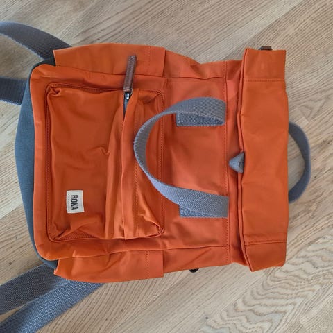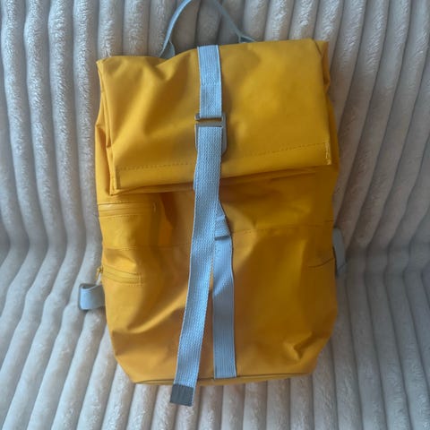 Roll top backpack in gray color. The backpack has a roll opening at the top with a strap and buckle, as well as a large front pocket with a zipper. At the bottom there is a separate zipper compartment that can be used to separate contents, for example shoes or workout clothes. The back has padded shoulder straps and a padded back panel. Visibly used but in a good condition.