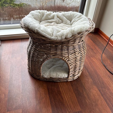 Rund katteseng i beige farge, laget i mykt stoff. Passer til katt eller liten hund. Hører sammen med et klorestativ, men stativet ble ødelagt så selger kattesengen. Har to til av samme katteseng om det ønskes. Lite brukt og ingen slitasje.