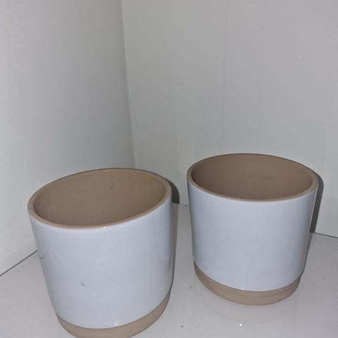 Sett med to blomsterpotter i keramikk. Pottene har en todelt overflate i beige og hvit. Egner seg til innendørs bruk til ulike typer planter / blomster. Størrelsene er ulike, med én større og én mindre potte i samme design. Se gjerne mine andre annonser med blomsterpotter