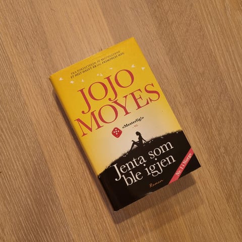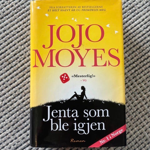 Jojo Moyes «Jenta som ble igjen» bok. Norsk utgave utgitt av Bastion forlag. ISBN 978-82-8313-164-2. Første utgave, første opplag 2018. Oversatt til norsk av Svein Svarverud. Trykt i Lithuania. Innbundet roman innen sjangeren samtidslitteratur/romantikk. Teksten er på norsk bokmål.