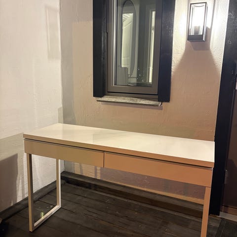 Pulten har rester av dobbeltsidig tape men den siden kan plasseres inn mot vegg.