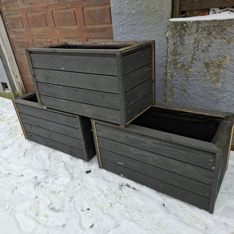 Blomsterkasser i tre, rektangulære og grå. Egnet til planting av blomster eller andre mindre planter. Passer til bruk på terrasse, balkong eller ved inngangsparti.