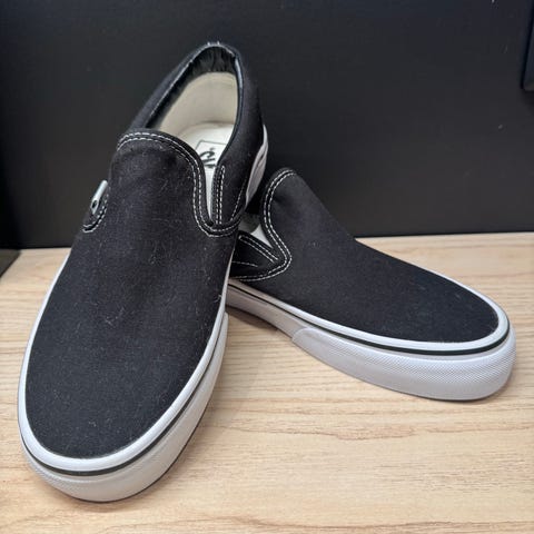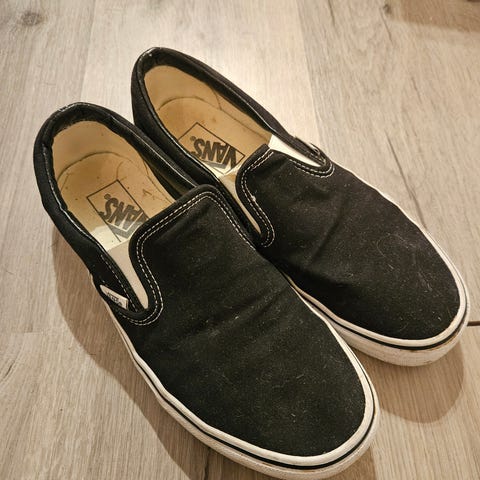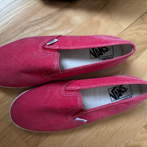 Vans Slip-On joggesko i størrelse 36,5 men tilsvarer heller en str 38. Passer meg som bruker 38 i sko til vanlig. Skoene er i oransje canvas med hvit såle og karakteristisk Vans-vaffelmønster under. Passer som hverdagssko eller fritidssko.