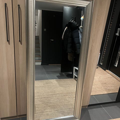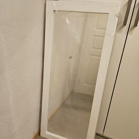 speil med rektangulær form og hvit ramme. Speilet måler omtrent 100 cm i høyden og 70 cm i bredden, basert på målebåndet på bildene. Rammen er i et lyst, glatt materiale som gir et enkelt og nøytralt uttrykk. Kan brukes som veggspeil i gang, soverom eller stue, og kan plasseres stående eller hengende etter behov og opphengsløsning som velges. Vet ikke merke.