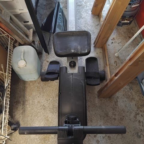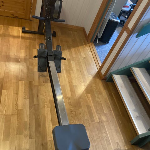 Tredemøllen har håndtak foran og løpebånd til gange eller lett løp innendørs. Romaskinen har sete på skinne, fotstøtter og håndtak for ro-bevegelse. Medisinballen er av merket Kayoba, 5 kg, i blå og svart farge, egnet til styrke- og kjernetrening. Trimsykkelen er en enkel, hvit modell med pedaler og styre, til lett kondisjonstrening.