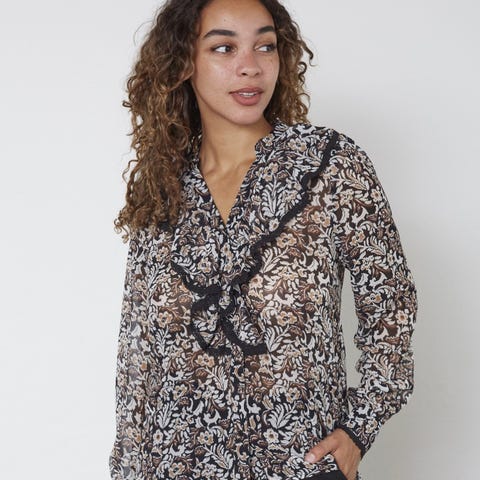 En lett bluse fra Second Female med et tøft slangeskinnmønster i varme toner. Blusen har en flatterende passform med skjult knepping i front og en klassisk kinakrave, som gjør den enkel å pynte både opp og ned.