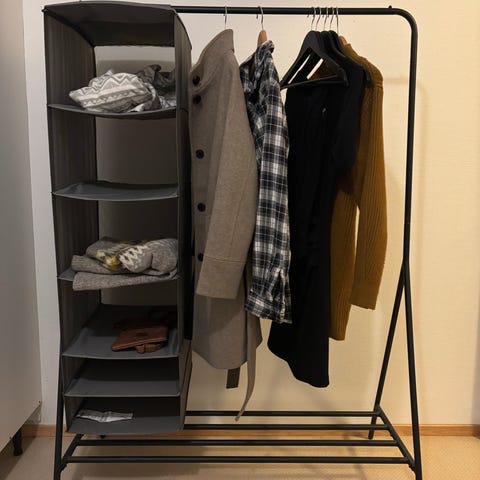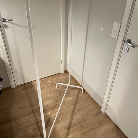 Hvit klestativ på hjul, justerbare høyde, har 3 stk. Selges 50 kr stk