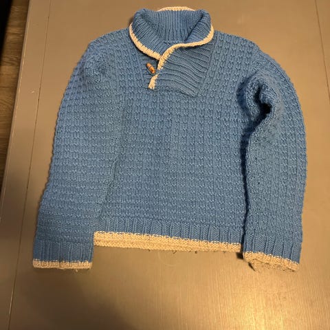 Hjemmestrikket genser, passet her hjemme fra 8-12 år