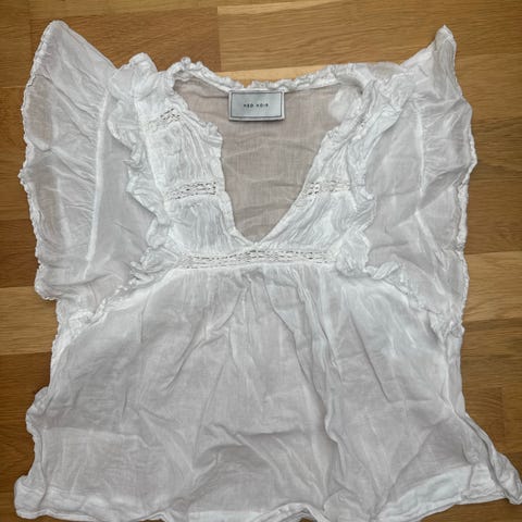 Neo Noir topp for dame i størrelse 40. Toppen er hvit og laget av bomull. Den har ermeløst snitt med volangdetaljer og rysjer foran og bak, samt lett innsving i midjen. Stoffet er tynt og lett, egnet til bruk alene eller over annet tøy. Vaskes på 30 grader skånsomt program ifølge vaskelappen.