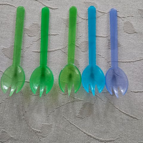 Sett med plastskjeer til små barn i ulike størrelser og fasonger. Skjeene er i flere farger, blant annet blå, gul, rosa, grønn, oransje og lilla. Egnet til bruk ved måltider, snacks eller dessert for barn. Laget i plast som kan brukes flere ganger og er lette å rengjøre.