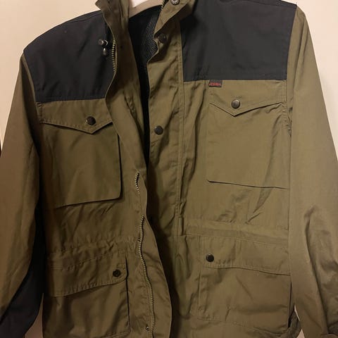 Mil-Tec Hunting jakke i størrelse M. Jakken er i grønn farge med mørkere partier på skuldre og overdel. Den har flere frontlommer med klaff og knappelukking, snøring i livet og nederst, samt høy krage. Materialet består hovedsakelig av polyester og bomull (se vaskelapp for detaljert sammensetning). Egnet som jakt- eller friluftsjakke i kjøligere værforhold.