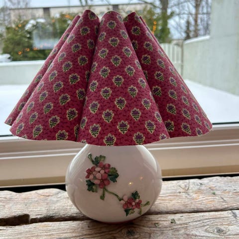Glasslampe fra IKEA med håndlaget skjerm fra Laura Asley