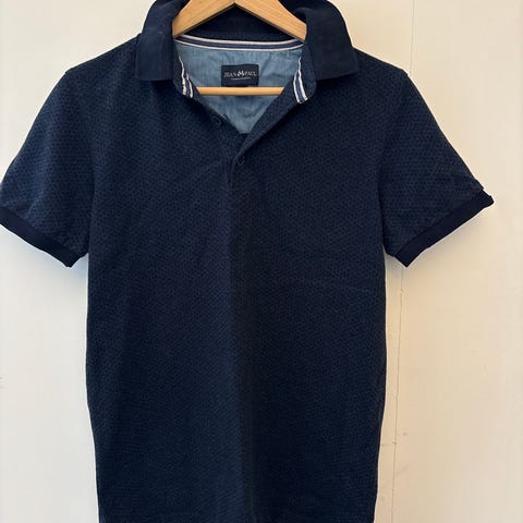 Jean Paul pique poloskjorte for herre i størrelse L. Skjorten er blå med horisontale hvite striper og har klassisk polokrage med knappestolpe. Brodert Jean Paul-logo på brystet og liten detalj i trikolor i siden. Kortermet modell i bomull, egnet til hverdagsbruk og fritid.
