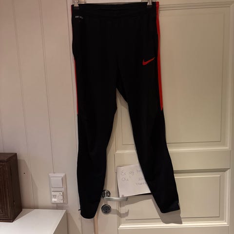 Nike Dri-Fit fotballbukse for herre i størrelse M. Buksen er svart med oransje detaljer og har elastisk linning med snøring for justerbar passform. Laget i lett, teknisk materiale med Dri-Fit-teknologi som transporterer fukt bort fra huden under aktivitet. Egnet til fotball og annen trening utendørs og innendørs.