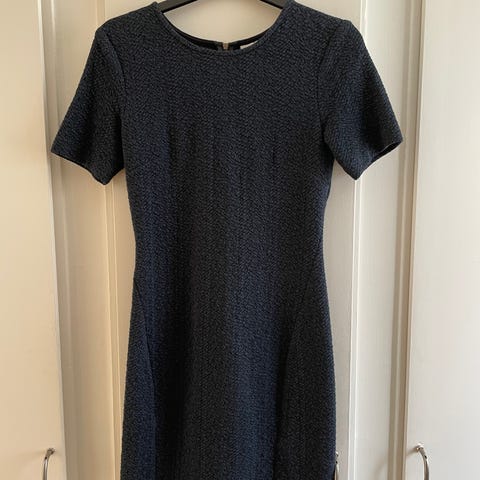 Noa Noa hverdagskjole for dame i størrelse L. Kjolen er blå og laget av bomull. Den har kort erm og et strukturmønster i stoffet. Passer som enkel hverdagskjole eller til mer uformelle anledninger.