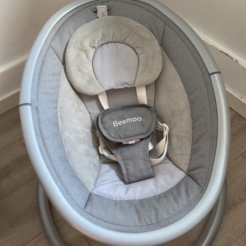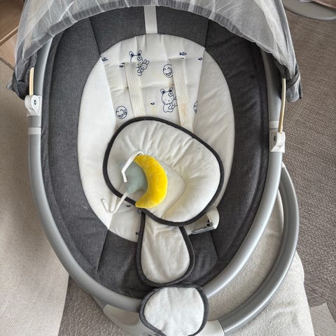 Vippestolen har polstret sete med avtagbar hodepute og justerbar sele for å holde barnet på plass. Den ovale sitteflaten er mykt polstret og kledd i tekstil. Stolen står på et stativ med innebygd motorenhet og betjeningspanel, samt medfølgende fjernkontroll for styring av funksjonene. Strømkabel følger med.