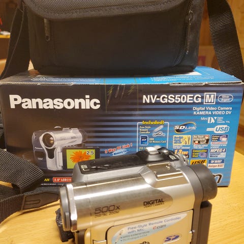 Velbrukt S-VHS-C videokamera som fungerer, men strømkabel fra strømforsyning og kamera mangler. Batteriene er også dårlige og holder strøm kun kort tid. Leveres med koffert, 3 batterier og strømforsyning.