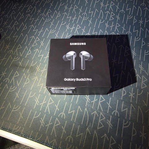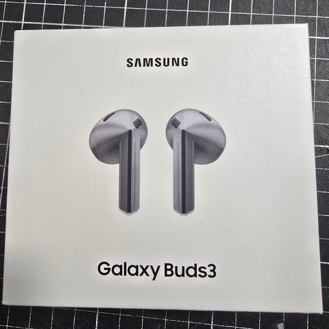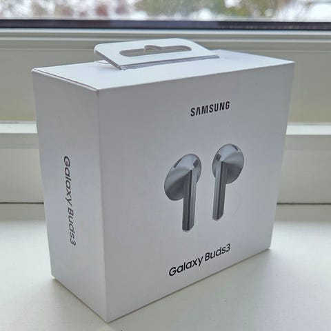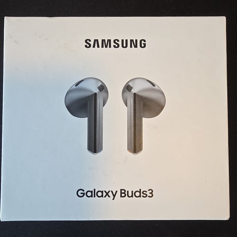 Pakken på bildene viser original eske med produktinformasjon og tekniske symboler fra produsenten Samsung Galaxy Buds3.