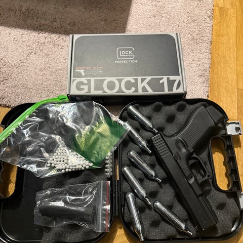 Selger min GLOCK 17 Gen5 MOS 4,5mm Pellet luftpistol med blowback med 1 magasin pluss en beholder til luftpistolen som du ser på bilde og co2 gass