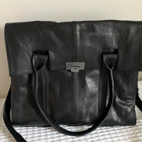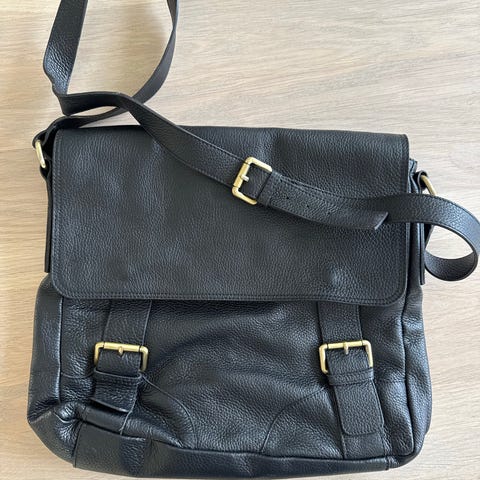 Tidløs modell med klaff og dekorative spenner foran. Praktisk størrelse med flere rom og glidelåslommer både foran og bak. Justerbar skulderstropp.