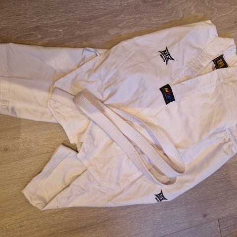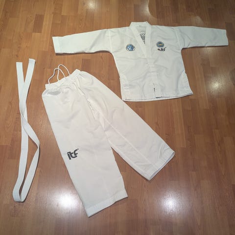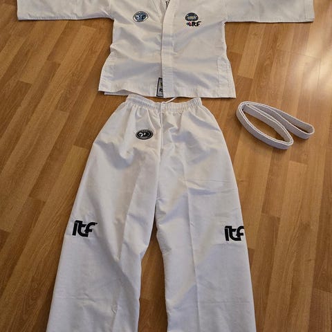 ITF Taekwon-Do drakt for barn i størrelse 140. Drakten består av jakke, bukse og hvitt belte. Farge hvit med ITF Taekwon-Do-logo og merker på jakke og bukse. Egnet til kampsporttrening i Taekwon-Do for barn rundt størrelse 140.