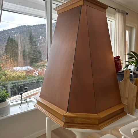 Kjøkkenhette i kobberfarge fra Røroshetta. Hetten har klassisk, rett fasong og er tilpasset montering under tak. Nederst og øverst er det en lysere list/kant som markerer overgangen mot selve ventilasjonsdelen. Passer til kjøkken der man ønsker en synlig ventilasjonsløsning i kobberstil.