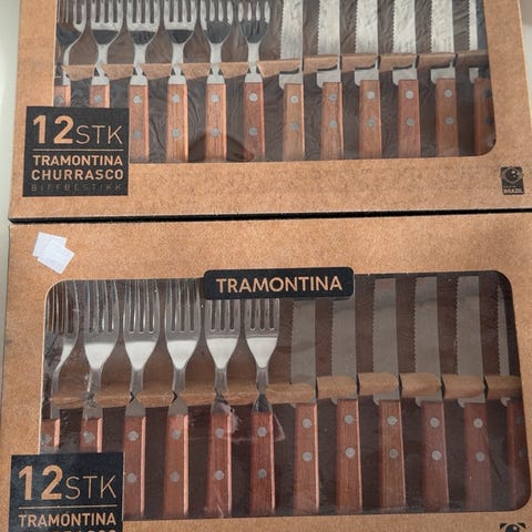Biff bestikk i 12 deler, svart treskaft, ingen stempel, lengde på gaffel 19 cm og kniv 21 cm,hel og fin, kan sendes, pris 200 kr