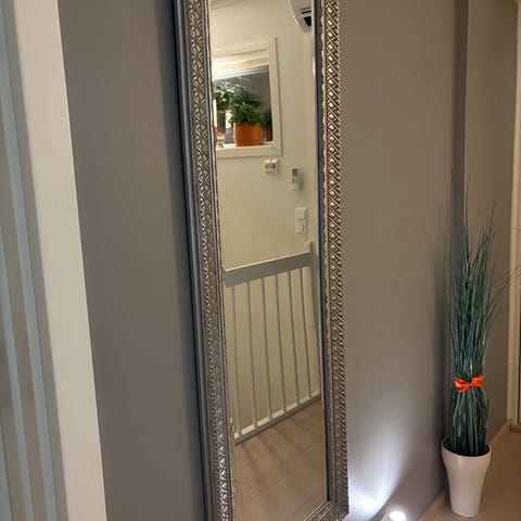 Rammen har fine detaljer som gir et elegant og tidløst uttrykk, og speilet passer like godt i gang, soverom eller stue. Kan stå på gulvet eller henges på vegg.