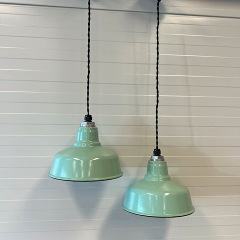 Selger to ubrukte lampeskjermer i grønt glass. Det er kun lampeskjermen som selges. Diameter lampeskjerm: ca. 25 cm.