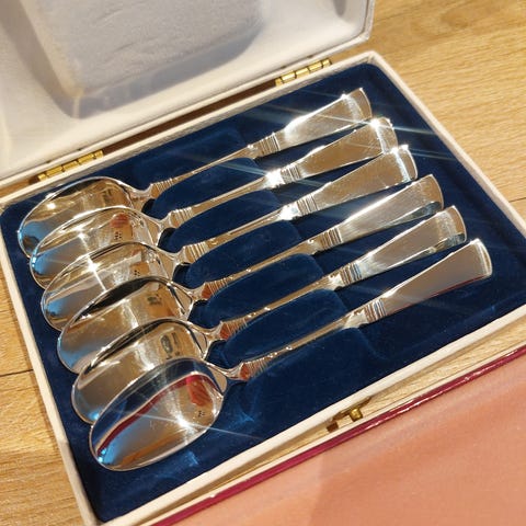 Vintage Dessert sett,av 6 skjeer og 1 stor skje, lengde på skje 12,5 cm,stor skje lengde 19,5 cm,hel og fin, ligger ikke i orginal eske, kan sendes, pris 200 kr