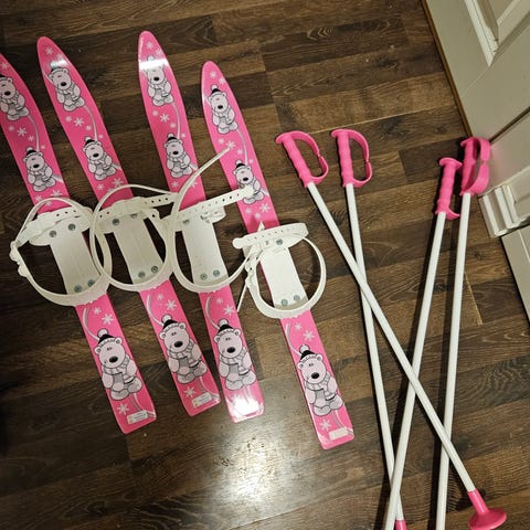 Barneski med langrennsstøvler (str 25) og Swix staver i blå og hvit farge. Skiene har motiv med snømann og er utstyrt med Rottefella-bindinger. Støvlene er myke barnemodeller med borrelåslukking for enkel justering. Passer til klassisk langrenn for barn. Settet inkluderer ski, sko og staver.