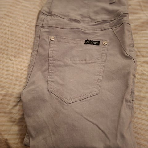 Floyd bukse for dame i størrelse M. Buksen er i gul farge og laget av bomull. Den har beltehemper i linningen, knapp og glidelåslukking foran, samt lommer foran og bak. Passformen er smal med smale ben.