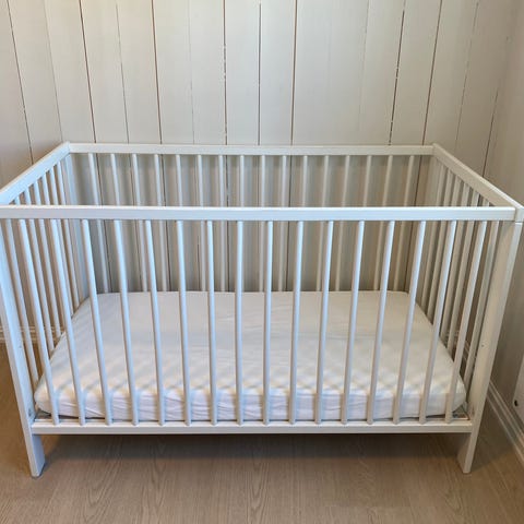 Moweo bedside crib babyseng i grå tekstil. Sengen har nettingfelt i sidene som gir innsyn og lufting. Den står på metallstativ med hjul for enkel forflytning. Liggeflaten har madrass med hvitt trekk. Stoffet på utsiden har en synlig rift/slitasje på én side, ellers fremstår sengen som funksjonell. Egnet som babyseng ved siden av voksenseng de første månedene.