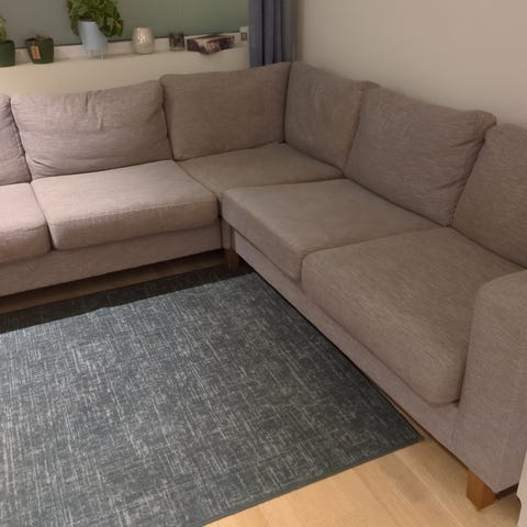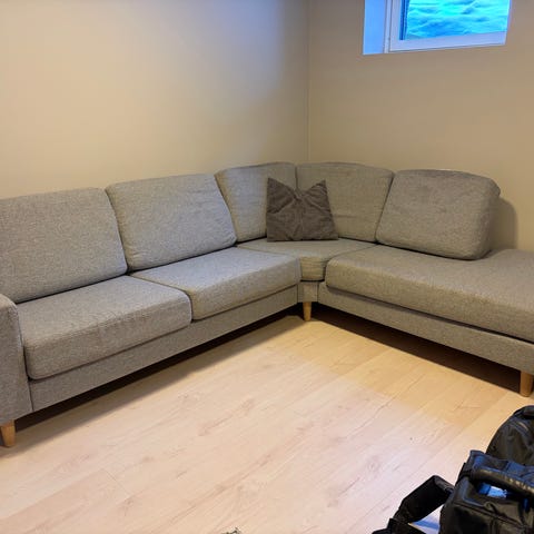 Stor og god sofa hjørnesofa med sjeselong. Mørk brun. Kjøpt på Skeidar i 2011/2012. Solid, gode puter. Mangler litt stoff på stammen nede i hjørnet, se bilde. Kan demonteres i 3 deler i tillegg til putene. Hjørnedelen ca 175 lang og sjeselong ca 150 lang.