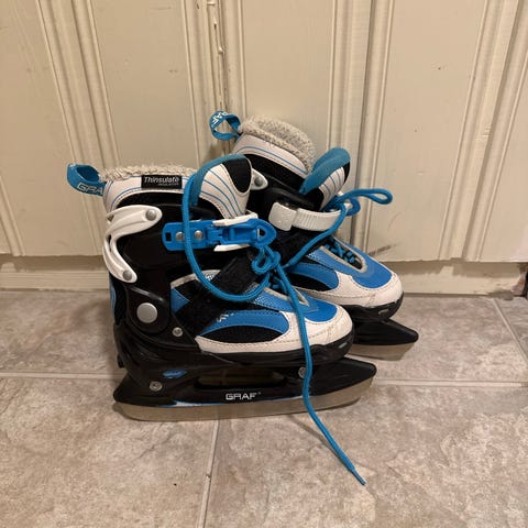 Aspen sport. Barneskøyter i blå og hvit farge med snøfnuggmønster. Justerbar plast- og tekstilkonstruksjon med snøring, borrelås og spennelukking for å holde foten på plass. Passer til barn, justerbar størrelse mellom 30, 31, 32 og33.