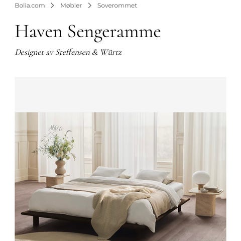 Bolia seng med sengegavl i tekstil i rosa tone. Sengegavlen har buet form og er trukket i mykt stoff med dekorative knapper. Sengen har ribbebunn og oppbevaringsplass under madrassen som kan løftes opp. Egnet som enkeltseng i soverom eller gjesterom.